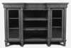 the corresponding rectangular top above ogee frieze carved with grotesques and centred by a strapwork panel, the central open and adjustable shelves with tooled dust flaps flanked by glazed cabinet with adjustable shelves and flanking fluted pilasters, raised on moulded square section feet