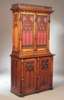 the moulded cornice carved with rose, thistle, shamrock and leaves, surmounted by cusped destiny, above pair of open gothic traceried doors flanked and divided by panelled buttresses, enclosing adjustable shelves, on deeper base with similar solid traceried doors and plinth base