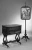 the hinged rectangular top with moulded edge enclosing compartmented tray, above panelled front and back and cockbeaded drawers (secured by internal pin) to sides, raised on shaped and pierced trestle ends joined by shaped flat stretcher