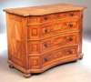 the top with projecting concave front above four corresponding long graduated drawers, with burr walnut, mahogany and boxwood panels, on bun feet