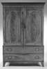 the moulded cornice above boxwood panelled frieze and pair of panelled doors with crossbanded flame veneered ovals enclosing hanging space, the base with two long drawers on splayed bracket feet (the upper drawer fixed and cut to provide deeper hanging space)