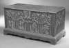 the planked top above panelled front and sides carved with Gothick tracery and figures, raised on shaped apron and bracket feet