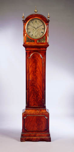 the twin train movement with anchor escapement, the circular silvered dial with subsidiary seconds and date dials, the arched hood with three brass finials, above stop fluted canted angles and pierced brass fretwork panels, the trunk with arched moulded door and canted stop fluted angles above a panelled base on bracket feet