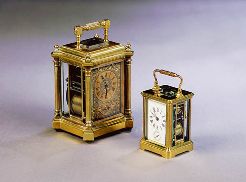 the twin train movement with lever platform escapement, striking the half hours on a gong, the enamelled dial within corniche case; with morocco leather case(2)