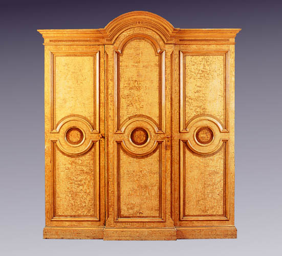the deep moulded cornice with inlaid panels and central segmental pediment above three doors centred by circular panels, enclosing hanging space and drawers, on plinth base