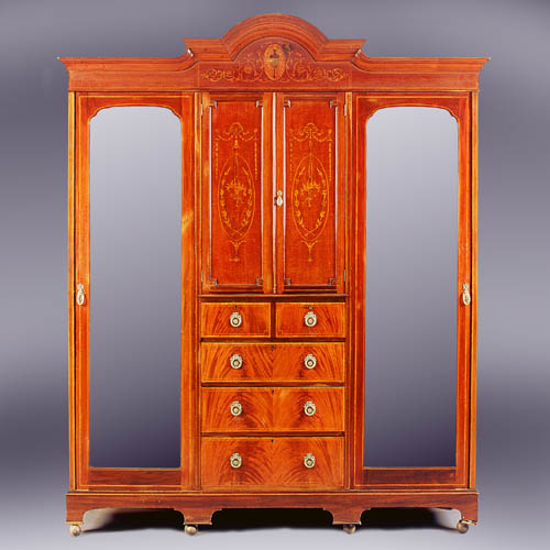with neo-Classical marquetry decoration, the moulded cornice with central stepped arch above a pair of panelled doors enclosing shelves and two short over three long drawers, flanked by mirror doors enclosing hanging space and drawers, on a plinth base with bracket feet and later castors.