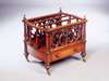 of rectangular form with bowed ends, the three open compartments with turned supports and pierced scrolling side panels, above single drawer and turned feet with brass caps and castors