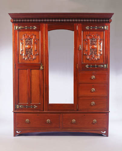 by R. Strahan & Co., Cabinet Makers and Shopfitters, Dublin, with linenfold panels and copper strap hinges and handles; comprising a triple door wardrobe, 177cm wide; a dressing chest, with swing mirrors and drawers, 106cm wide; a washstand 105cm wide; a pot cupboard 45cm; and an associated 4' bed
