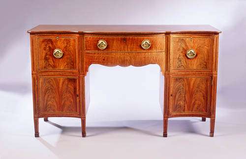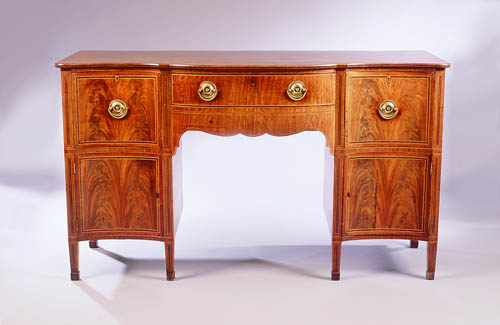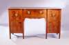 the whole decorated with rosewood crossbanding and panels, boxwood and chequer stringing, the shaped top above bowed frieze drawer with apron below, flanked by concave drawers, one a cellaret, with cabinets below, raised on tapering legs with splayed feet, (modern back)