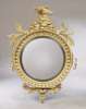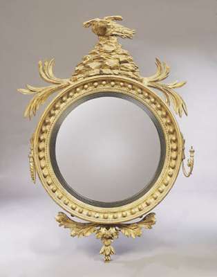 the circular plate within reeded ebonised slip and deep moulded frame with applied balls, the eagle surmount with rocky plinth, flanking sconces (nozzles lacking), and acanthus pendent
