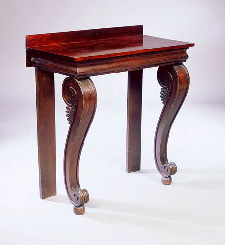 the later rectangular mahogany top with ledge back above ogee frieze, raised on two flat panelled consoles with athemion detailing and scroll toes onbun feet