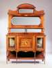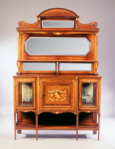 the raised back with an arrangement of mirrors and spindle galleries on inlaid square supports united by a shelf, the base with a door having an inlaid panel of a lady playing a lute, flanked by glazed doors above an open spindle gallery on square supports