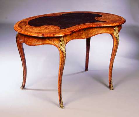 in the French manner, with kingwood crossbanding, the kidney shaped top with tooled leather panel and moulded crossbanded edge above shaped freize with concealed drawer and moulded cabriole legs with gilt brass mounts