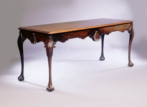 the rectangular top with rounded angles and moulded edge above deep shaped freize centred by shells to each side, raised on four shell carved cabriole legs with ball and claw feet