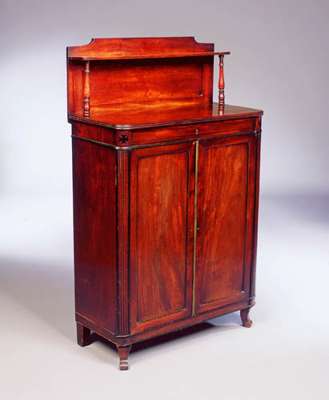 the shelved upper stage with turned supports over single drawer and two panelled cupboards with canted and fluted corners on short curved square section legs,