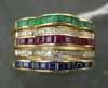 comprising four rings each shaped to the front, three channel set with a border of square cut rubies, sapphires and emeralds, together with a diamond ring designed as two rows into which the others may be inserted (one at a time)