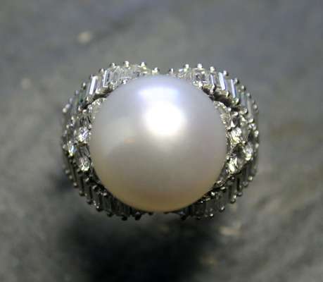 the domed front with central pearl of approximately 13mm diameter, flanked to either side by seven graduated claw set brilliant cut diamonds, within baguette cut diamond borders
