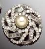 of shaped circular form, set to the centre with a large cultured pearl approximately 11.5mm diameter, with brilliant cut diamond floral cluster interchangeable centrepiece, within a spiralling surround set with baguette and round brilliant cut diamonds
