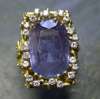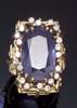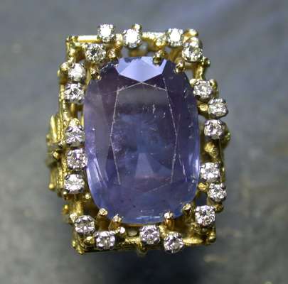 the central large oval cut sapphire within a border of brilliant cut diamonds claw set at intervals to a pierced textured surround