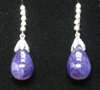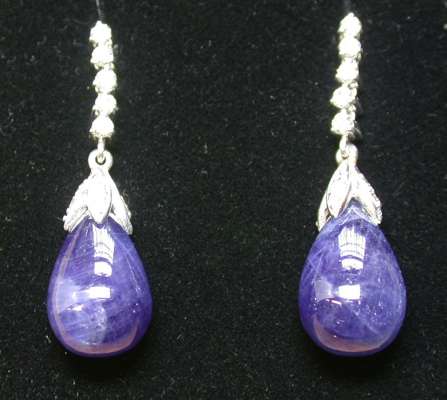 each composed of a line of five claw set brilliant cut diamonds surmounting a pear shaped cabochon sapphire drop