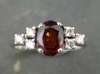 the central claw set oval cut garnet flanked to either side by three round brilliant cut diamonds