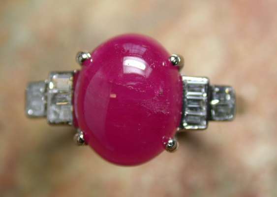 the central claw set oval ruby cabochon flanked to either side by five channel set baguette cut diamonds, stamped 750