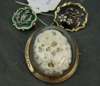 of shaped circualr form, applied to the centre with an urn and floral wreath set with rose cut diamonds, to a deep green guilloche enamelled ground, within a white enamelled and seed pearl set border, 2.5cm diameter, a seed pearl set mourning brooch, with locket apperture to reverse, inscribed, 3.5cm and a gilt metal mounted oval brooch/pendant with central floral carved ivory panel beneath a glass dome, 5.2cm wide (3)