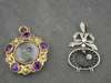 of shaped circular form with central glazed locket with enamelled floral decoration, within a floral and foliate scroll surround collet set with five circular cut amethysts, 2.5cm diameter, together with a pierced oval pendant with central old European cut diamond drop and rose cut diamond set bow-tied ribbon surmount, 2.8cm long (2)