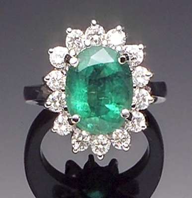 the central oval cut emerald claw set within a surround of brilliant cut diamonds