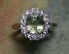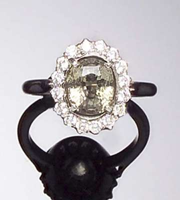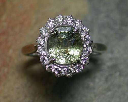 the central oval cut light green sapphire within a surround of brilliant cut diamonds, stamped 750