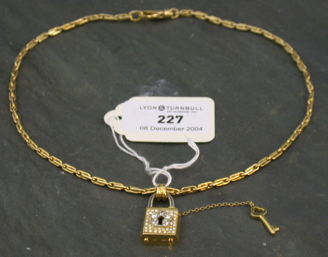 pave set with graduated brilliant cut diamonds, with key, suspended from an 18ct yellow gold fancy link chain