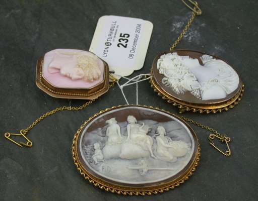 to include a 9ct gold mounted oval brooch carved to depict classical figures in a landscape setting, 6cm wide, another oval brooch carved with a classical female portrait profile and an octagonal brooch set with a similarly carved pink shell (3)