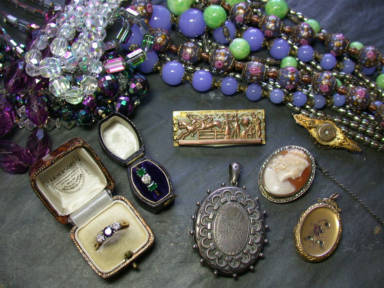 to include an 18ct gold mounted sapphire and diamond three stone ring, a three stone ring with central old cut diamond flanked to either side by a green composite stone, a 15ct gold diamond set bar brooch, two lockets, a cameo brooch, another brooch and several bead necklaces (qty)