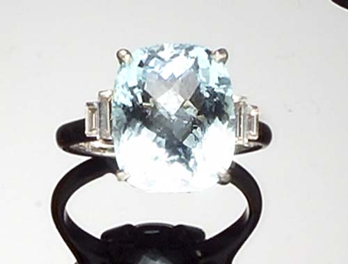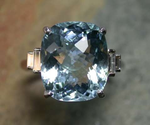 with central claw set cushion cut aquamarine flanked to either side by two graduated baguette cut diamonds