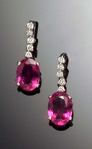 A pair of deep pink tourmaline and diamond pendant earrings,