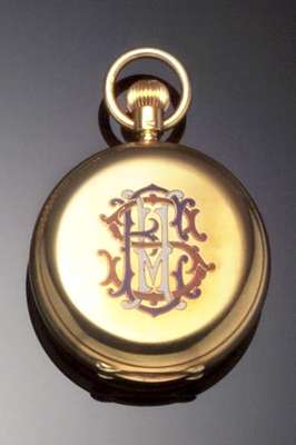 the white enamel dial with black Roman numerals and two subsidiary dials - seconds and up/down. inscribed "Victor Kullberg, London, 6916", the movement also inscribed, with the various awards and medals gained in the latter part of the 19th century, the front case monogrammed in red, white and blue enamel. Contained in the original fitted case