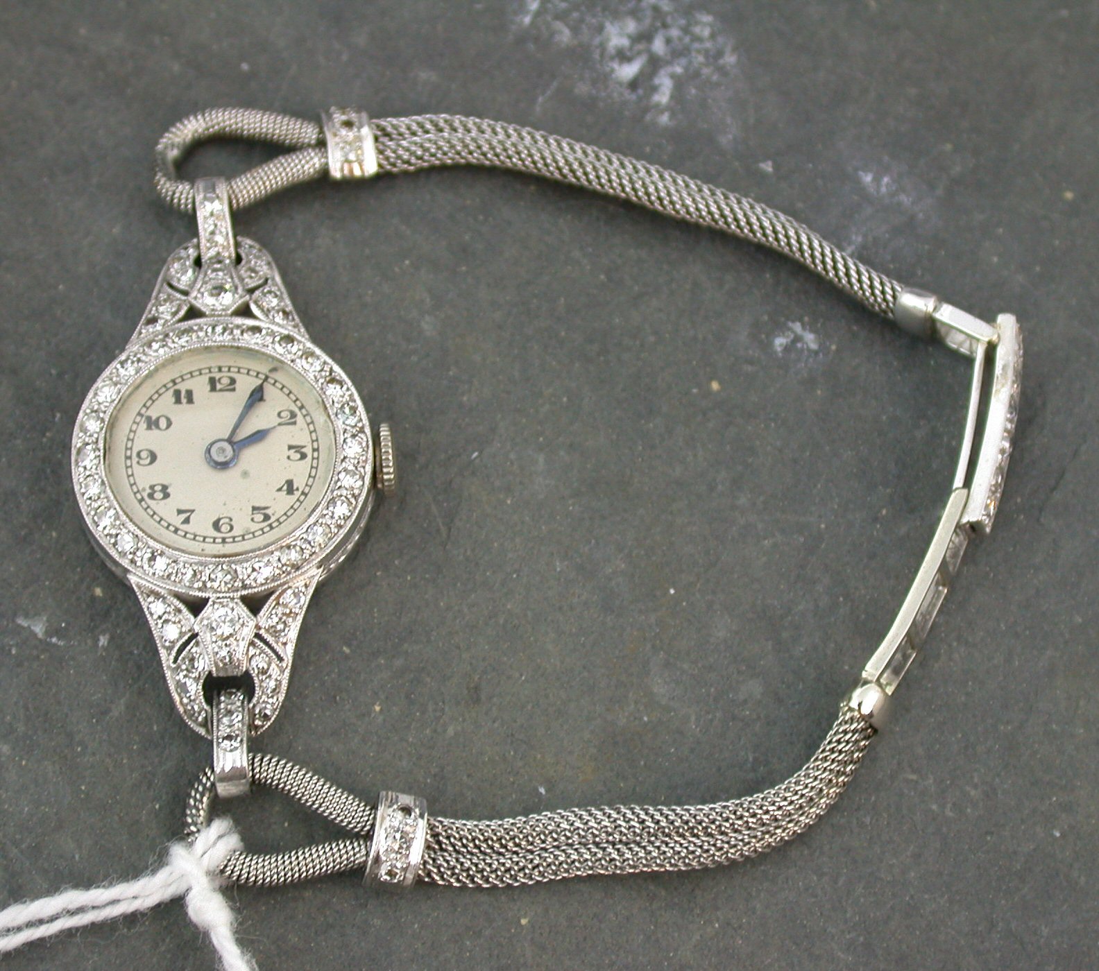 the circular champagne dial with black arabic numerals and hands, with single cut diamond set bezel, pierced diamond set shoulders and interwoven bracelet with diamond set clasp, inscribed to reverse, contained in a fitted case