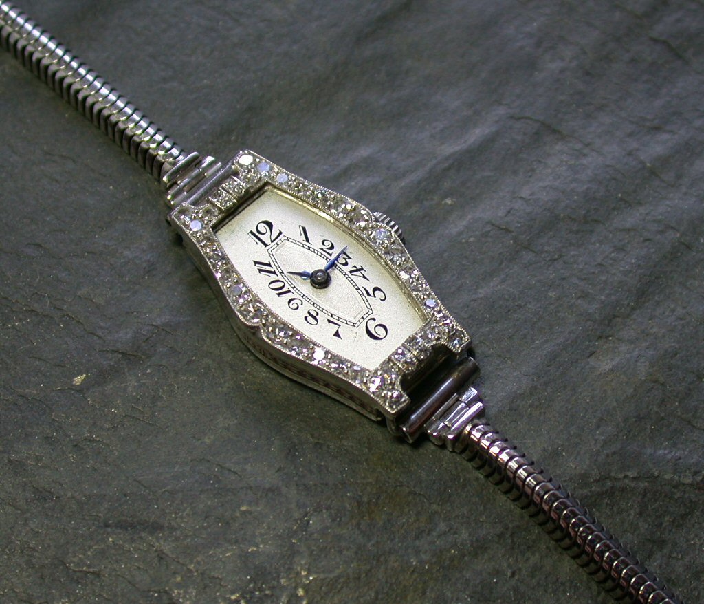the tonneau shaped dial with black arabic numerals and hands, with single cut diamond set bezel and later 9ct white gold snake link bracelet. (Lacking glass.)