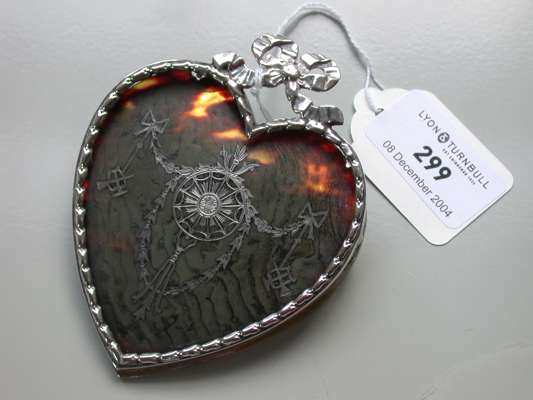 with marks for London 1907, maker William Comyns, of heart form with central pique work decoration