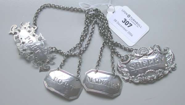 to include a a pierced escutcheon wine label, with marks for Glasgow 1862, maker WCS, incised PORT, a pair of canted rectangular labels, with thistle, duty mark and maker's mark IH only, incised MADEIRA and PORT, and another wine label with marks for Edinburgh circa 1857, maker J & W Marshall, with shell and foliate scroll border incised SHERRY (4)