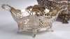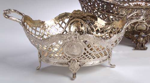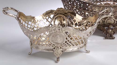 with import marks for London 1898, of shaped oval form, with reeded tied rim and handles, diaper pierced sides with laurel swags and a vignette with a male portrait profile, all on four scroll feet, with gilt interior, crested