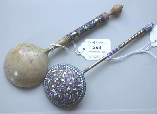 with spiral twisted and enamelled stem and knop finial, the bowl decorated with flowers and scrolls in shades of red, blue, green and white, together with a mounted wooden ladle, with similar cloisonne enamel decorated stem and ball finial (2)
