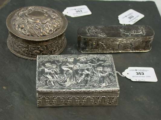 with marks for London 1894, maker William Comyns, decorated with birds, foliage and scrolls, monogrammed, 9cm diameter, a continental rectangular box with hinged cover, with import marks for Chester 1904, the cover decorated with figures in a woodland setting, the sides with stiff leaf border, 10cm wide, and an oval hinged lidded box, with import marks for Chester 1910, decorated with putti and scrolls, 11.5cm wide (3)