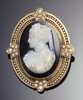 the oval cameo carved to depict a female portrait profile, within bead borders set with clusters of graduated half pearls to the cardinal points