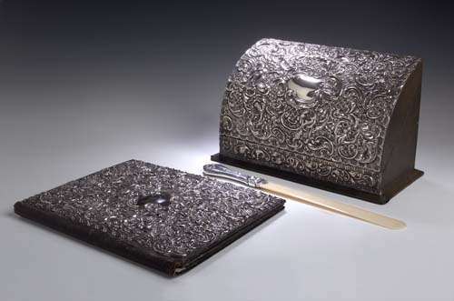 comprising a mounted writing box, with marks for Birmingham 1909, maker Synyer & Beddoes, with foliate scroll mount to the hinged domed cover, 29cm wide, a mounted writing folio, London 1904, maker William Comyns, 30cm x 23cm, and a mounted ivory page turner, Birmingham 1902, 35cm (3)