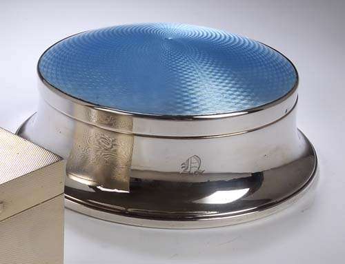 with marks for Birmingham 1927, maker Sanders & Mackenzie, the hinged slightly domed cover decorated with pale blue guilloche enamel