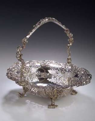 with marks for London 1909, maker Goldsmiths & Silversmiths Co. Ltd, of shaped oval form with shell and foliate cast edge incorporating winged insects, cherubs and portrait masks, the handle similarly cast, the sides pierced with scroll panels, raised on four mask capped scroll feet