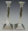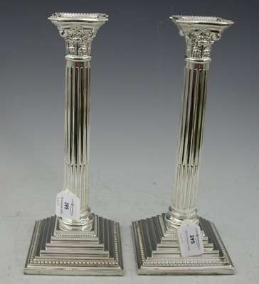 with marks for Sheffield 1998, maker MC, the stepped square bases with bead borders, beneath semi-fluted and reeded columns, corinthian capitals and shaped square sconces also with bead borders