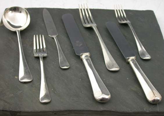 with marks for Sheffield 1923, comprising table knives and forks, dessert knives, forks and spoons, tea knives and forks, fish knives and forks, and soup spoons for twelve settings, together with a soup ladle, a three piece carving set, a pair of gravy spoons, a pair of fish servers, a pair of sugar tongs, four mustard spoons and three salt spoons (one matched), contained in a fitted mahogany case with hinged cover and fitted with two drawers to the front