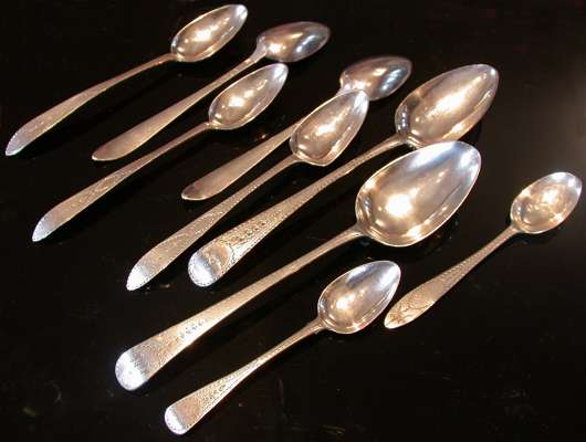 with marks for Dublin 1787, maker JS, of pointed old English pattern, bright engraved, also two Irish bright engraved teaspoons and two bright engraved tablespoons, various dates and makers (9)
